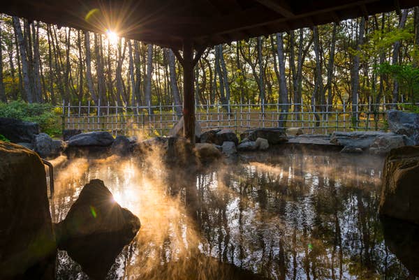 무성한 소나무 숲에 자리 잡은 미네랄이 풍부한 미인의 탕